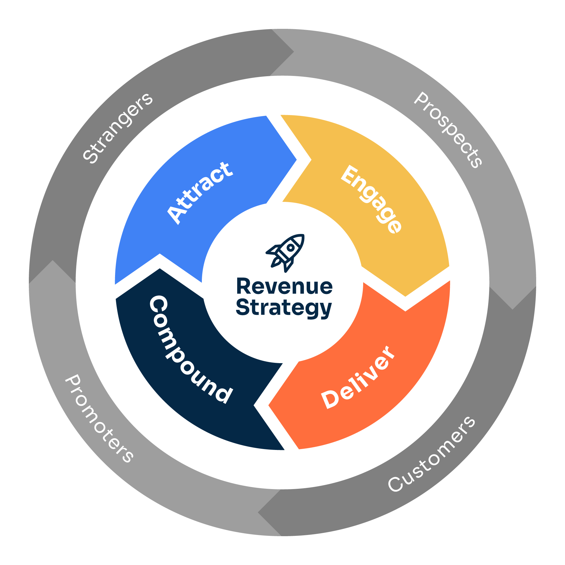 The Revenue Flywheel has four main stages, tied together by a comprehensive Revenue Strategy developed at the start.